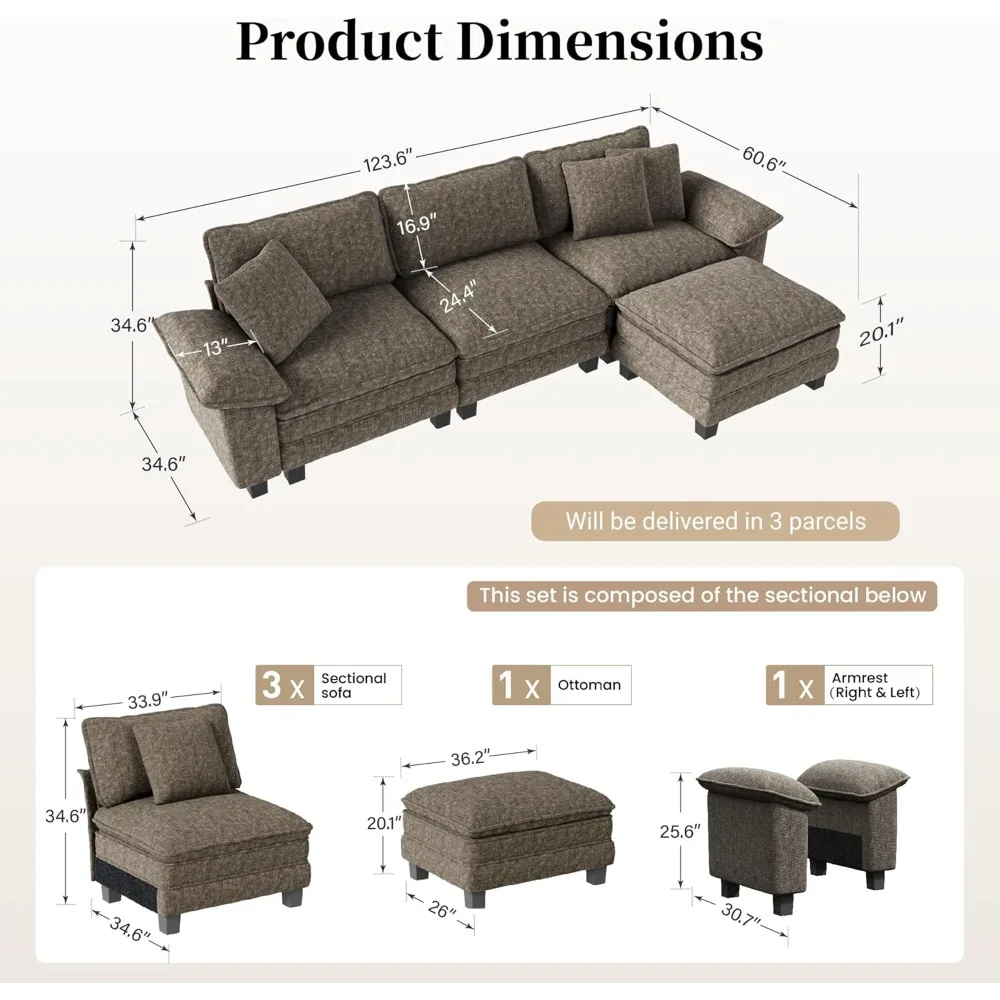 - FLEXIBLE COMBINATION: Unleash your creativity with our modern sofa! The rearrangeable seats and sides let you customize your layout weekly. Whether you're hosting parties, rearranging your living space, or just craving a fresh look, this sofa grows with your life's changes. Note: Will be delivered in 3 parcels, and they may not arrive at the same time. Please wait patiently.